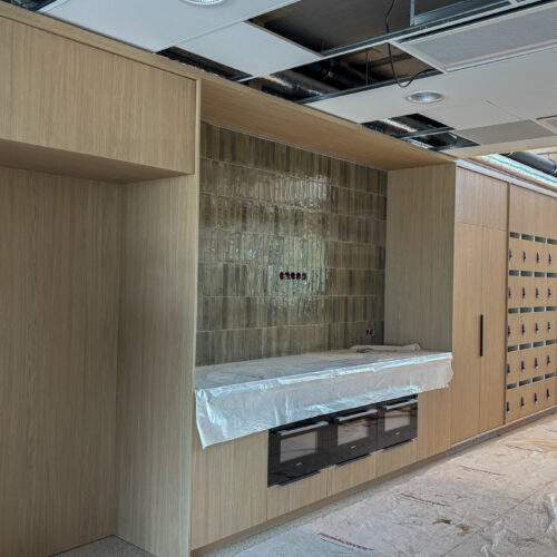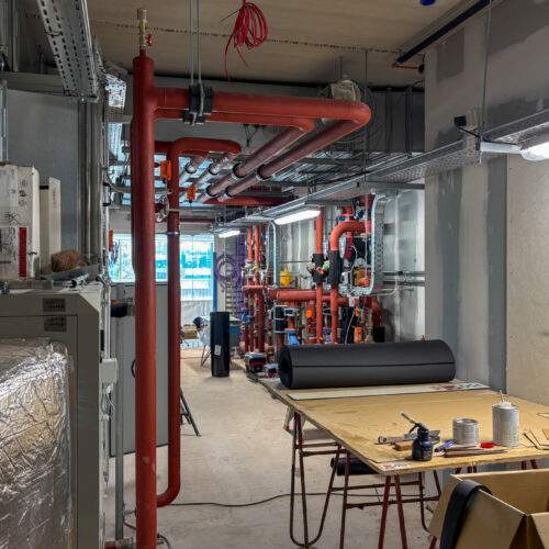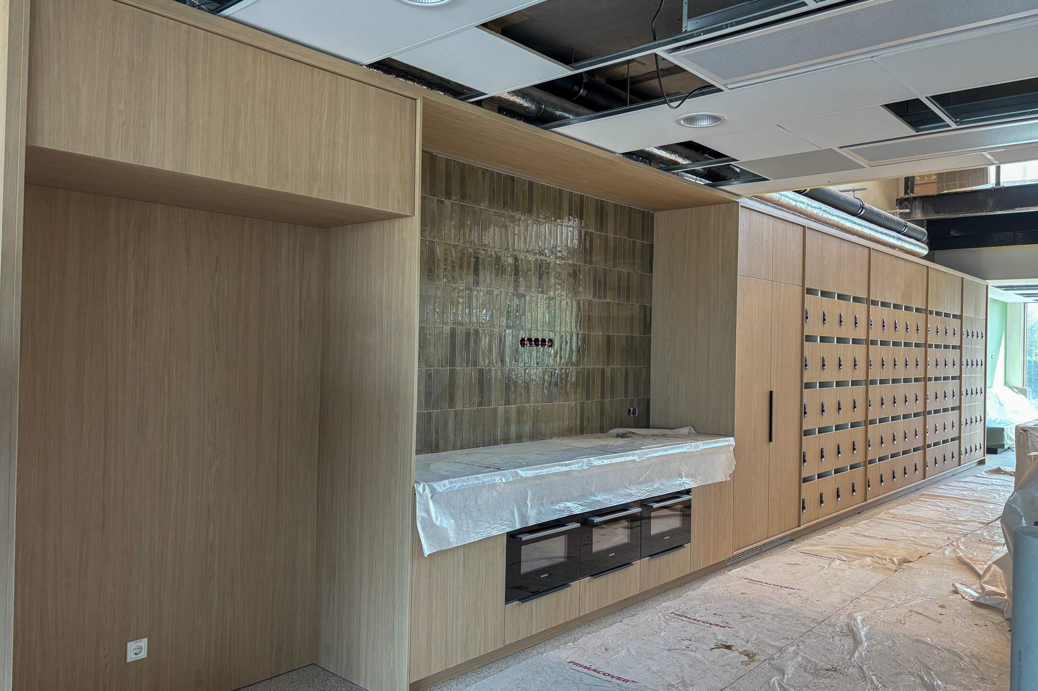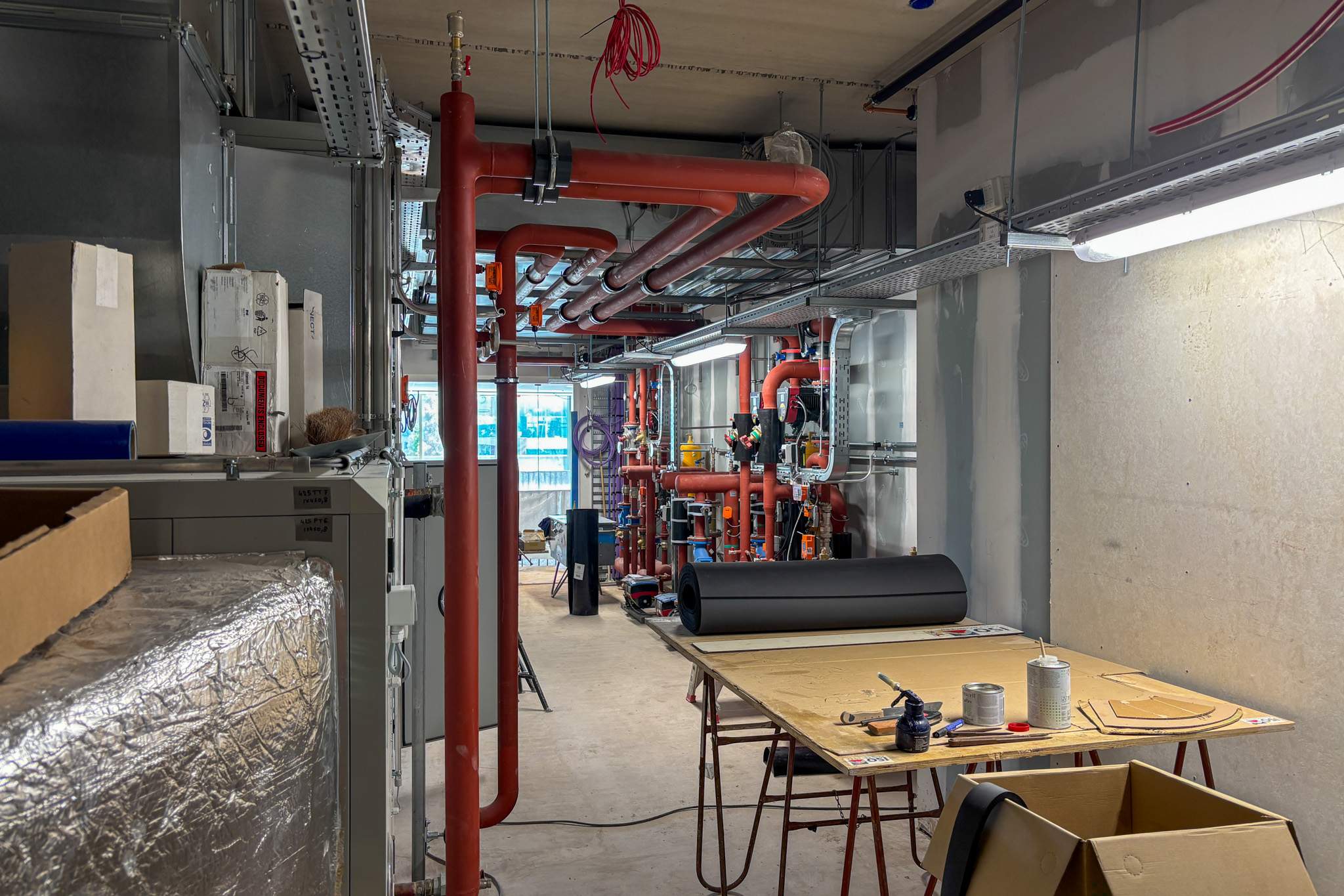 In de technische ruimte worden de laatste installaties aangesloten en ingeregeld, waaronder ventilatie- en klimaatapparatuur. Ook is de nieuwe kastenwand met lockers en de keuken geplaatst, wat het interieur steeds meer zijn definitieve uitstraling geeft. Tegelijkertijd wordt op de vloeren gewerkt aan de afwerklaag, waarbij de gietvloer zorgvuldig wordt aangebracht. De afbouw vordert zichtbaar en de oplevering komt steeds dichterbij.