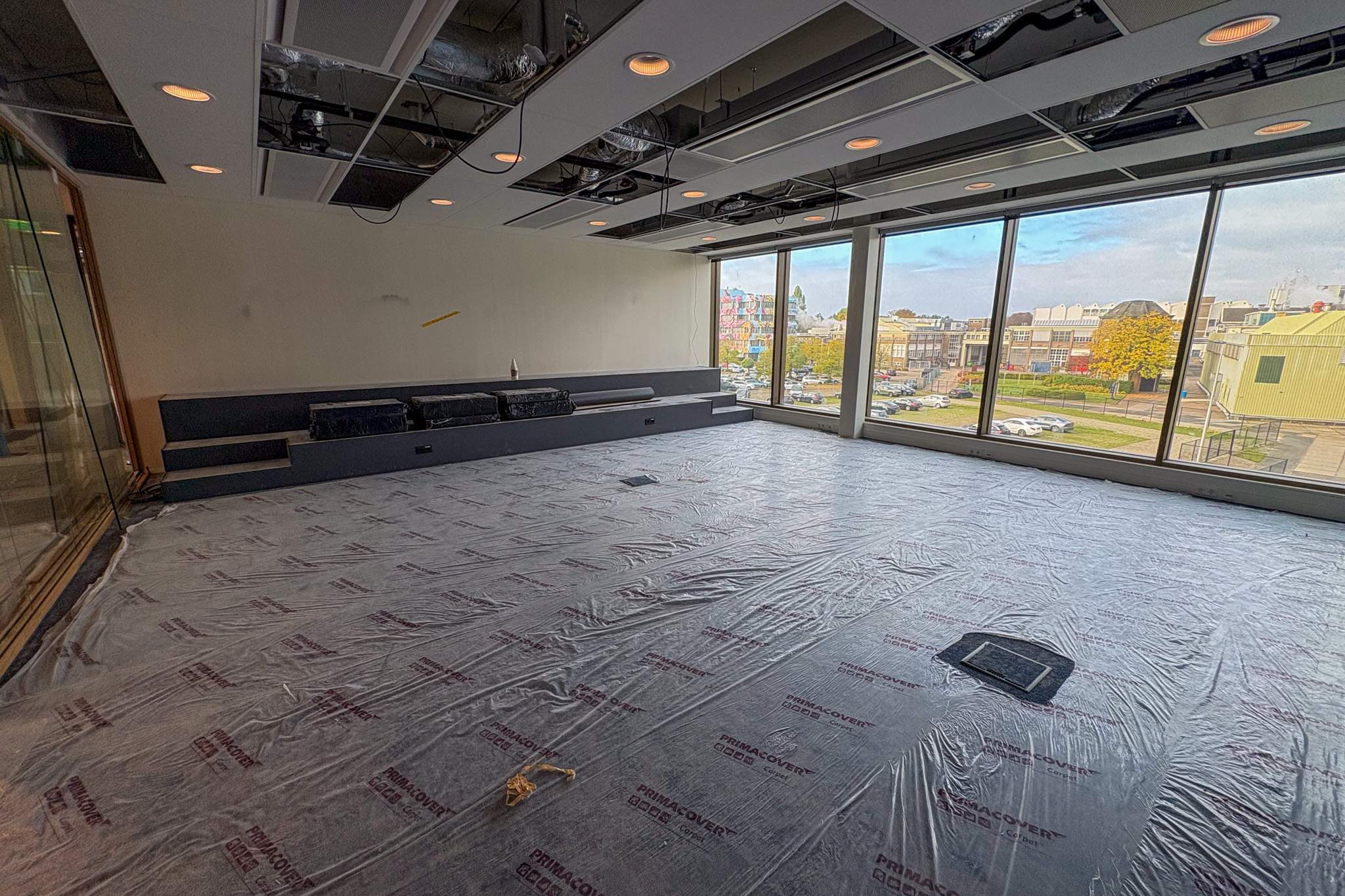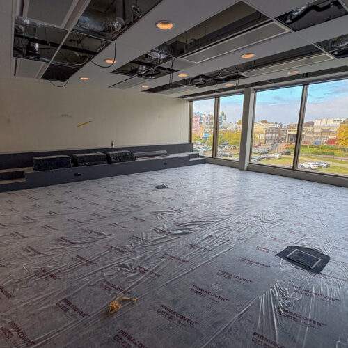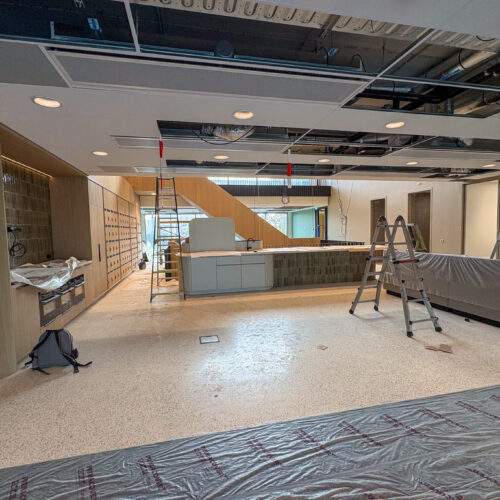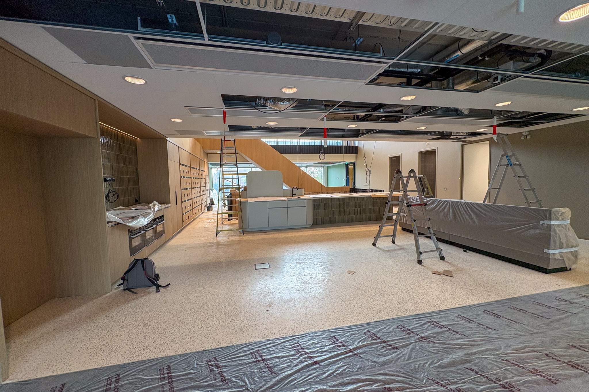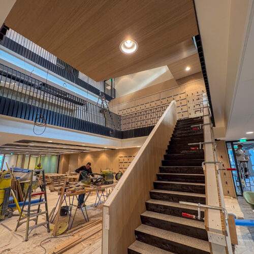 Terwijl de derde en eerste verdieping reeds is opgeleverd, komt de volledige oplevering steeds meer in zicht. Binnen vinden de laatste details van de afwerking plaats. Ook de trap in de centrale hal laat zien dat de laatste details worden afgewerkt voor gebruik.