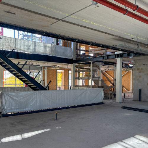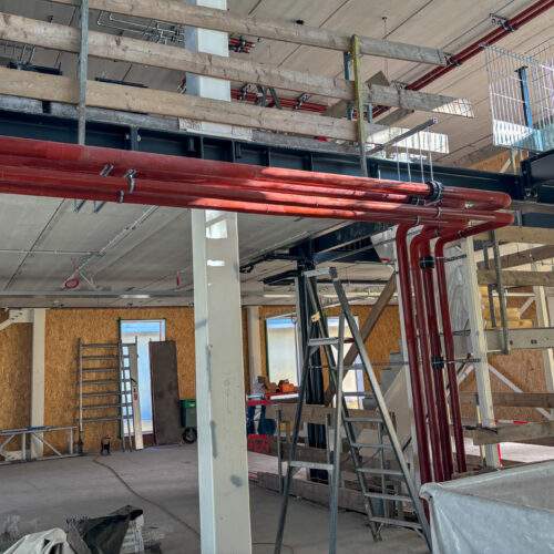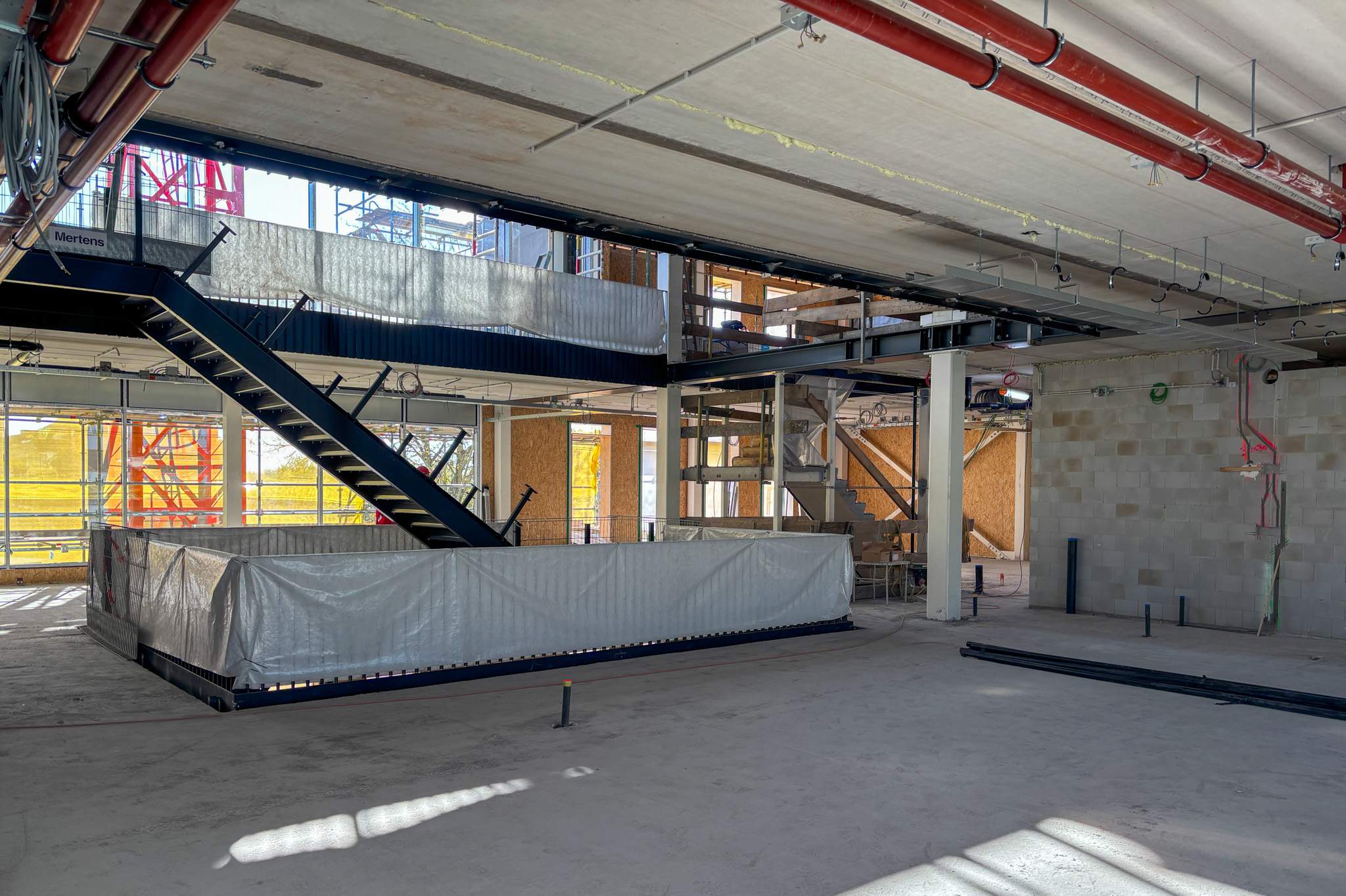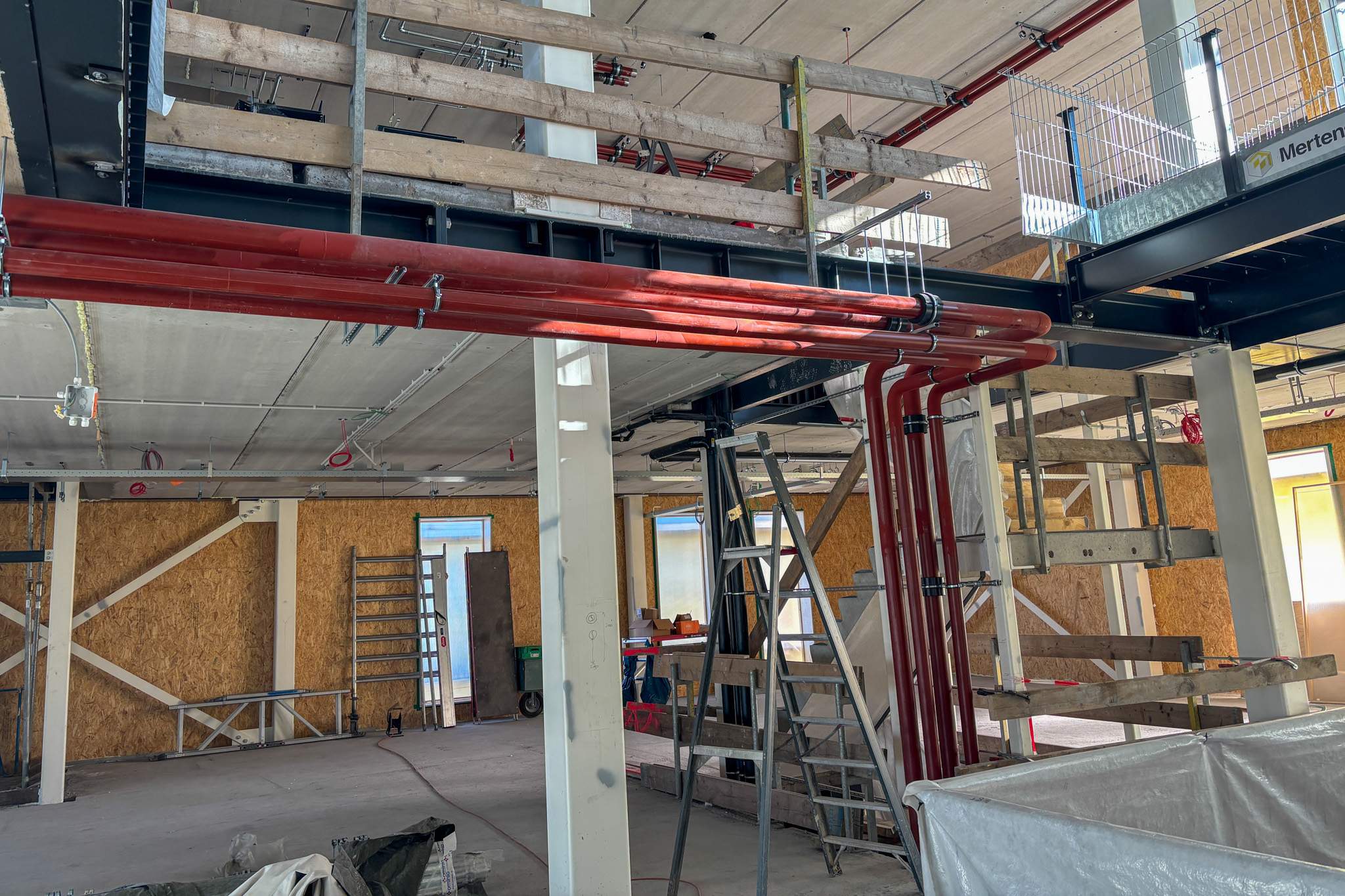 Binnen worden de leidingen inmiddels aangelegd en krijgt de trap steeds meer vorm. Buiten is de bouwkeet verplaatst en staat de stellage voor de toekomstige overkapping al klaar. Ook de ramen van de patio zijn geplaatst.