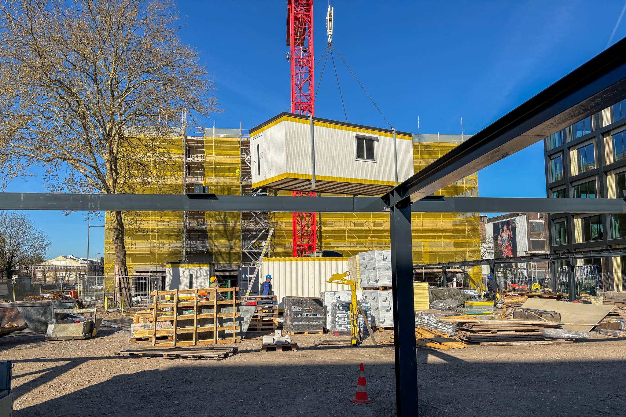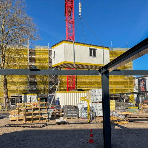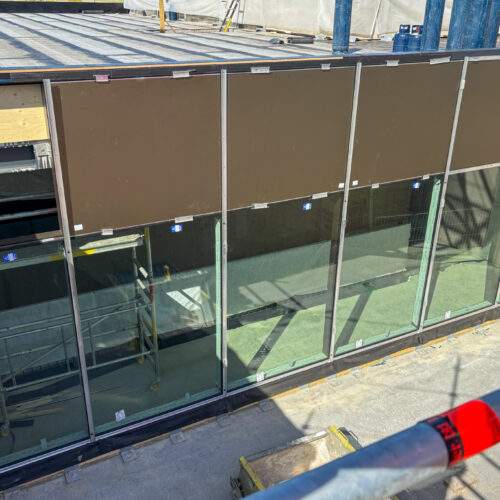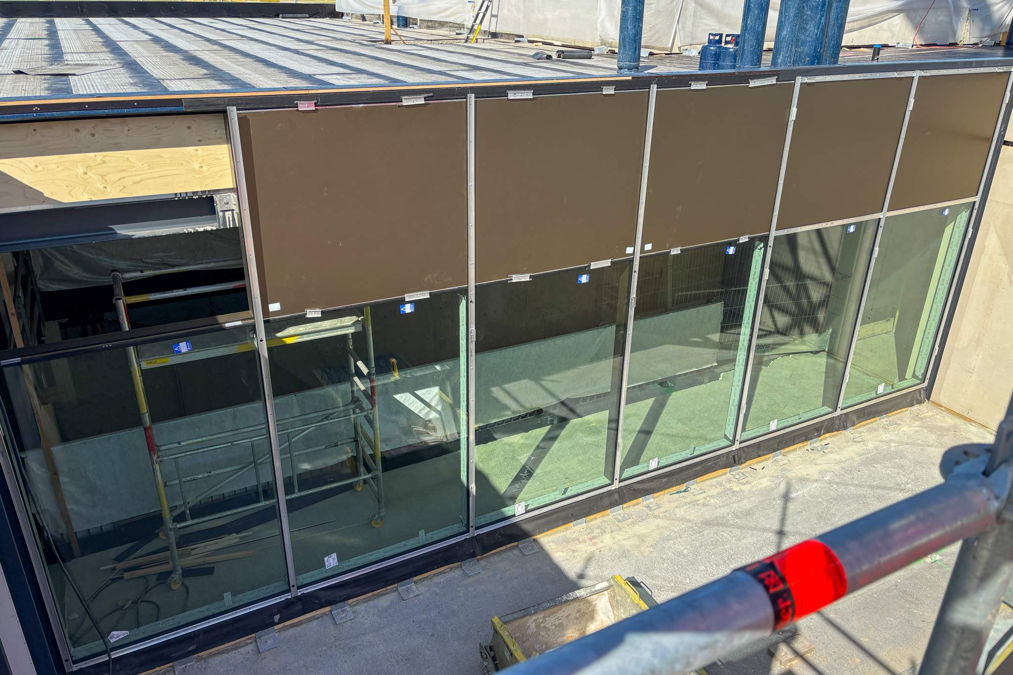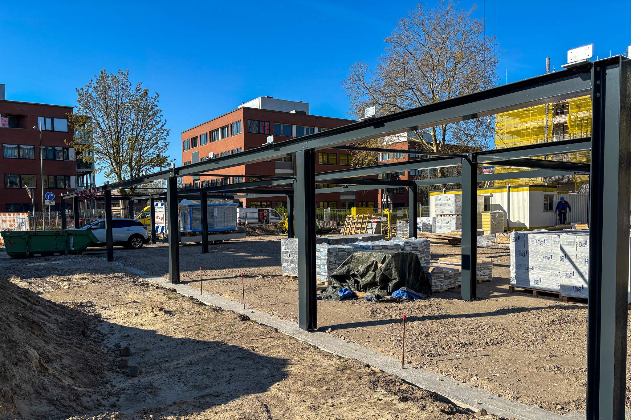 Binnen worden de leidingen inmiddels aangelegd en krijgt de trap steeds meer vorm. Buiten is de bouwkeet verplaatst en staat de stellage voor de toekomstige overkapping al klaar. Ook de ramen van de patio zijn geplaatst.