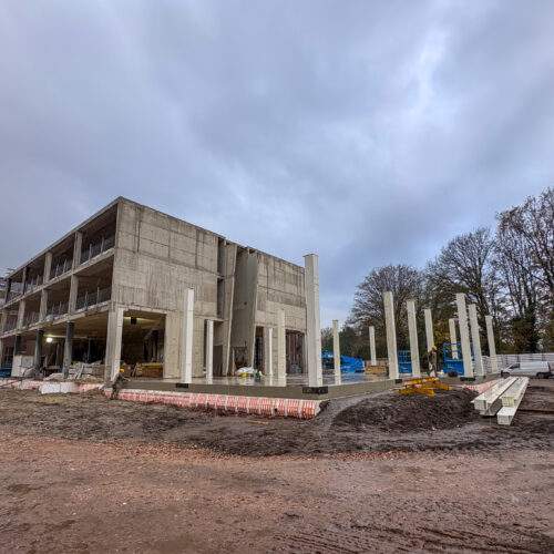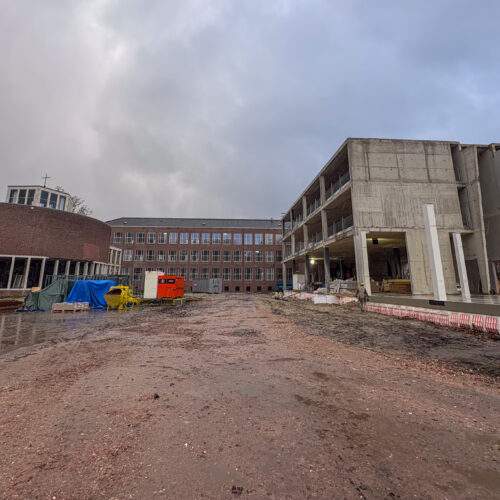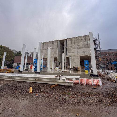 De eerste stalen kolommen van de nieuwbouw staan al overeind. De komende weken gaat de afbouw verder in het bestaande gebouw. Voor het einde van dit jaar storten we de betonvloer van het atrium en plaatsen we aansluitend de gelamineerde houtconstructie.