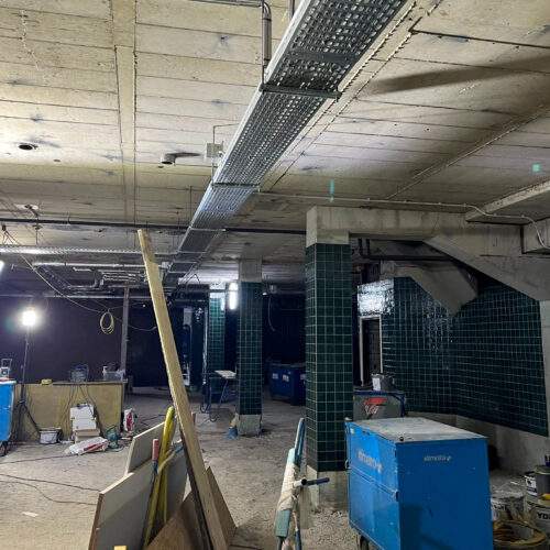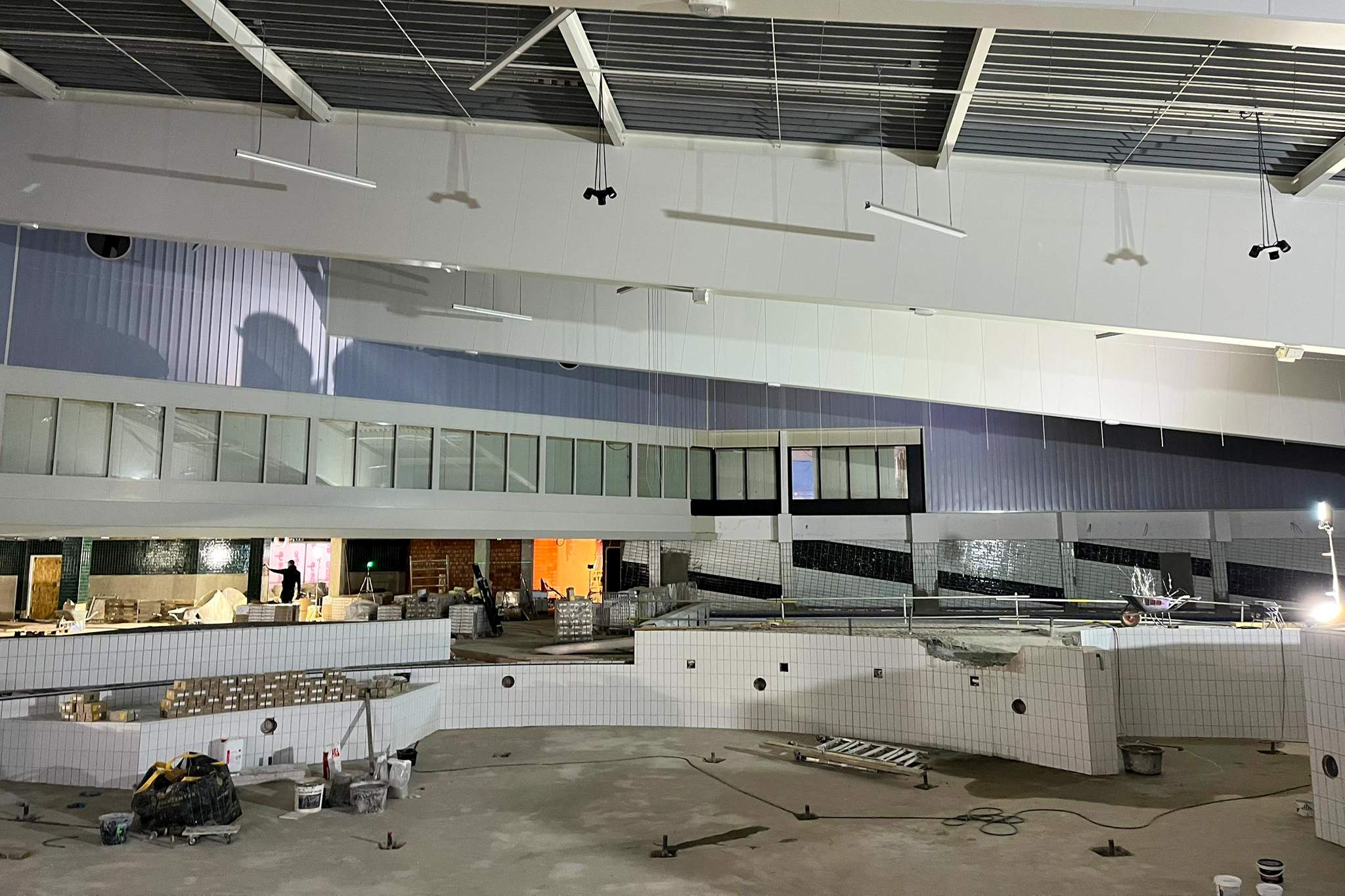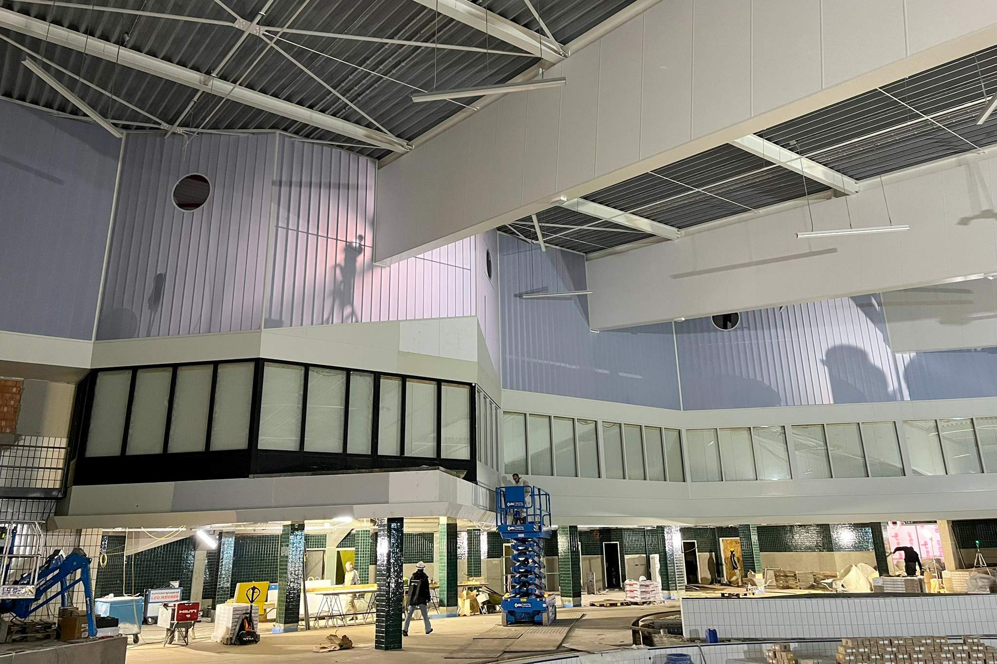In het recreatiebad zijn al smeervloeren aangebracht en wordt binnenkort gestart met het waterdicht maken van de tegelvloer. De speciale Rodeca-voorzetwand en het wandtegelwerk zijn vrijwel klaar. In de kleedlokalen is een groot deel van de cementvloer gesmeerd en dankzij de nooddakbedekking kan daar veilig worden doorgewerkt.