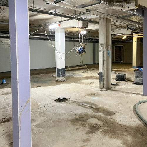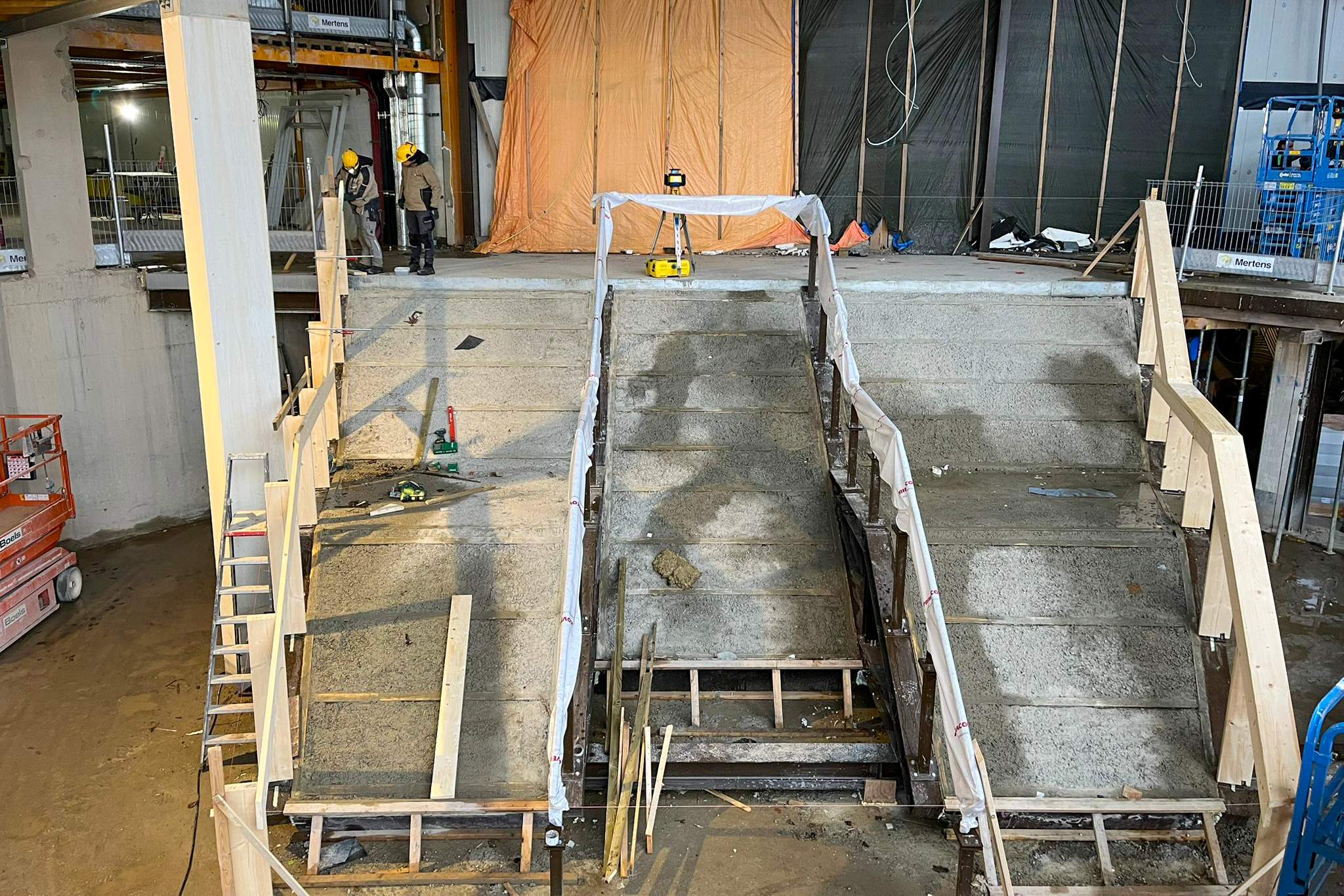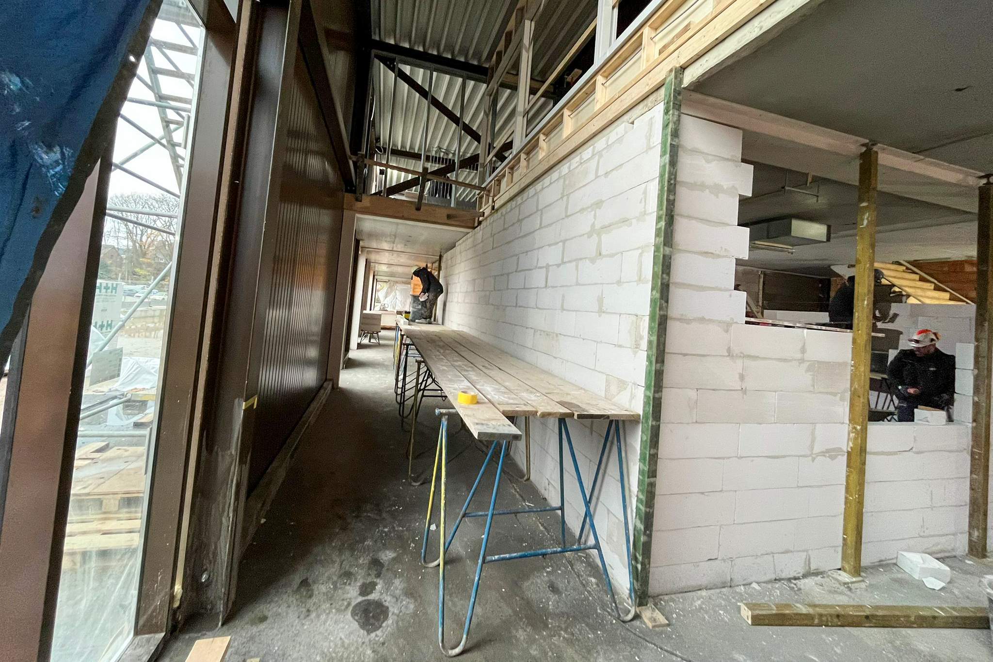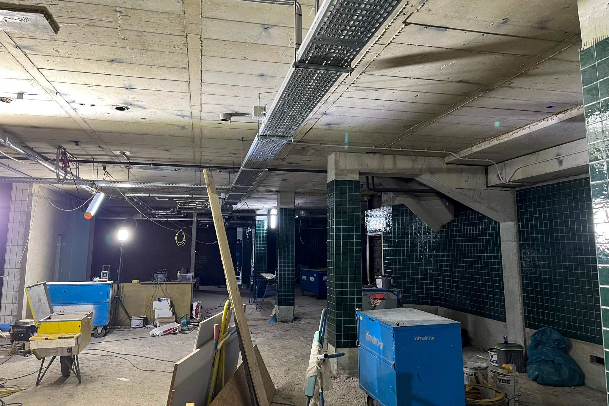 In het recreatiebad zijn al smeervloeren aangebracht en wordt binnenkort gestart met het waterdicht maken van de tegelvloer. De speciale Rodeca-voorzetwand en het wandtegelwerk zijn vrijwel klaar. In de kleedlokalen is een groot deel van de cementvloer gesmeerd en dankzij de nooddakbedekking kan daar veilig worden doorgewerkt.