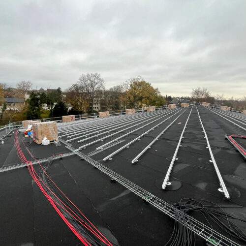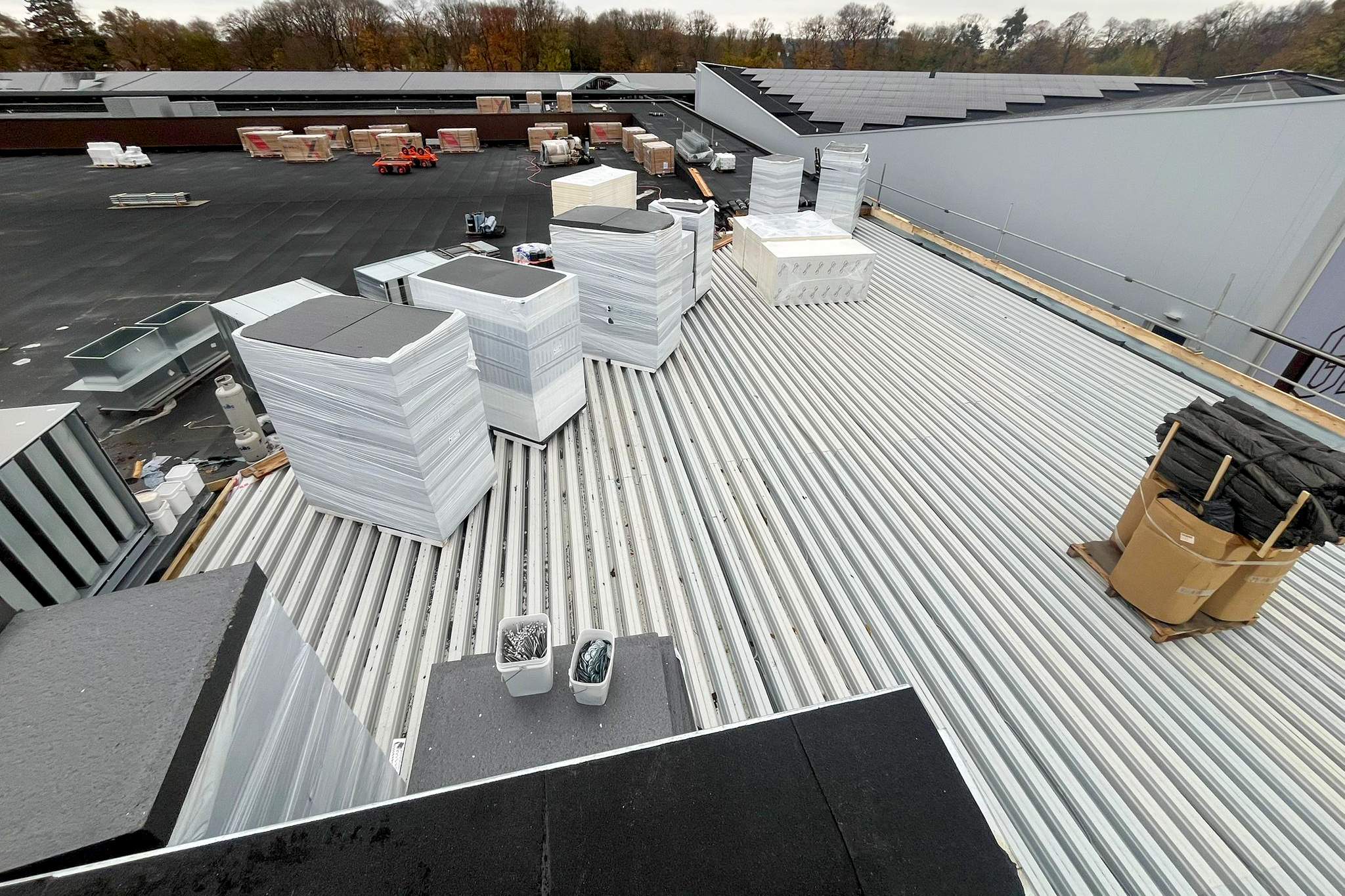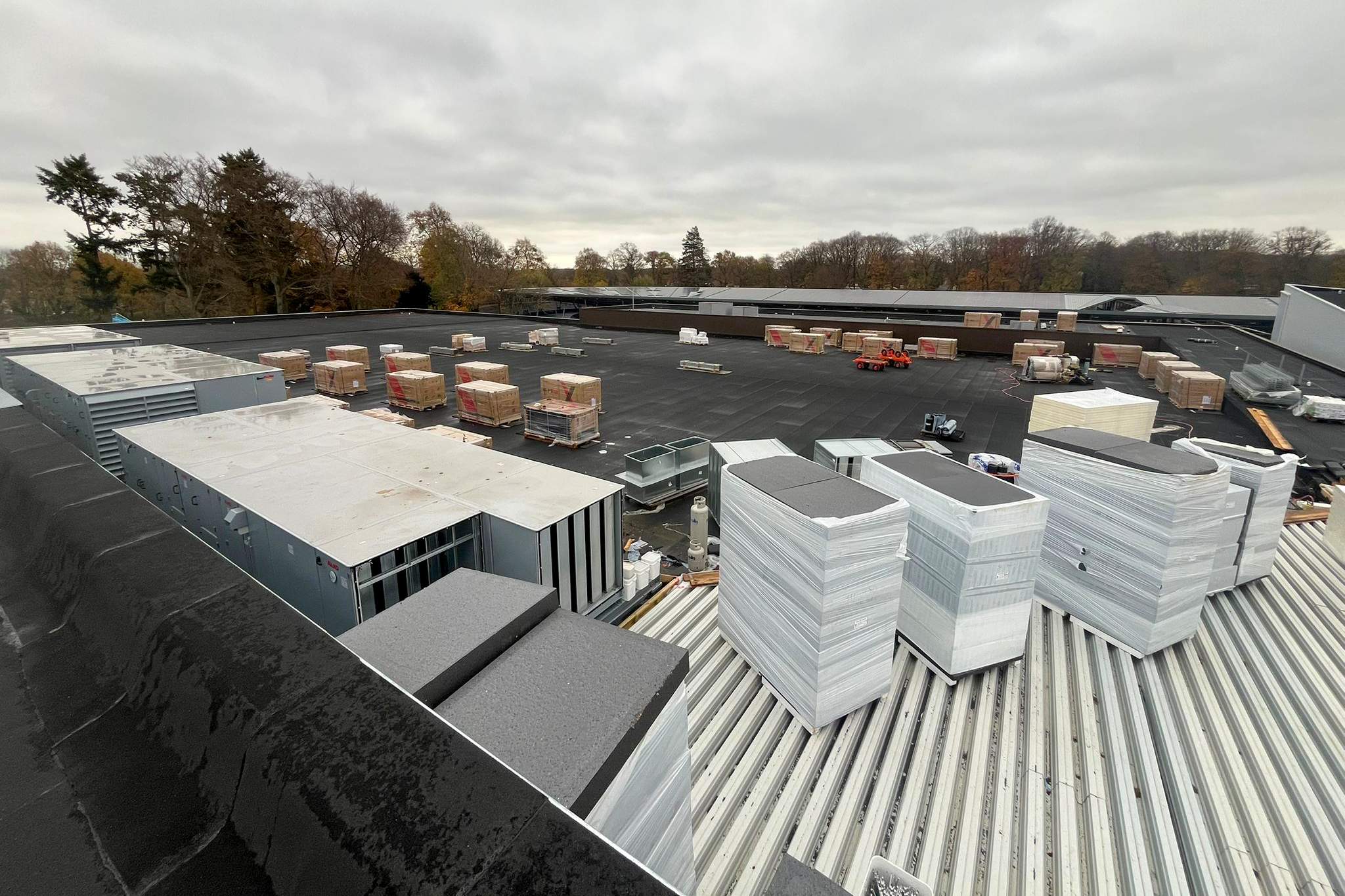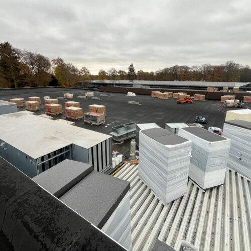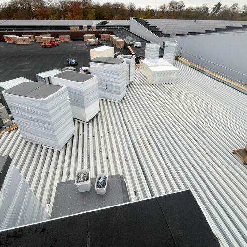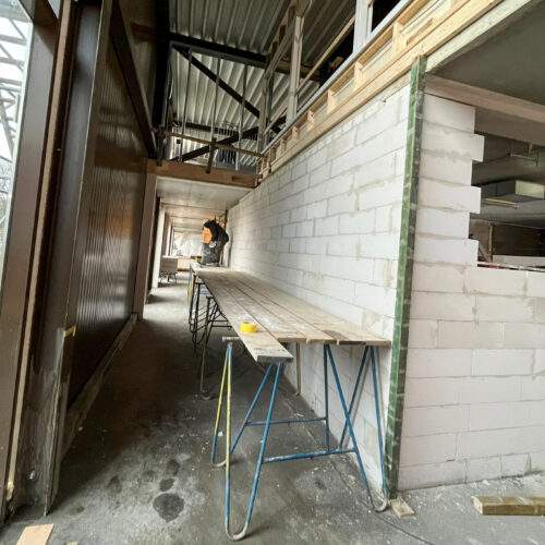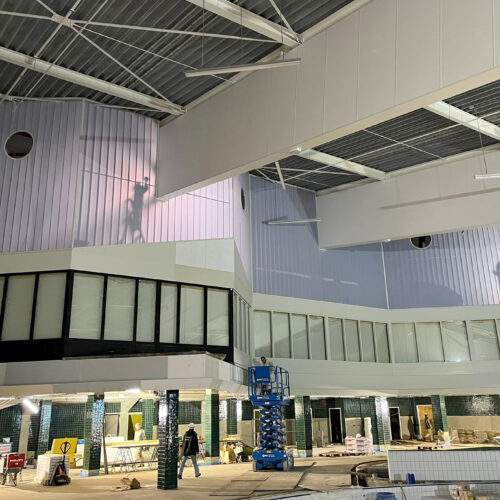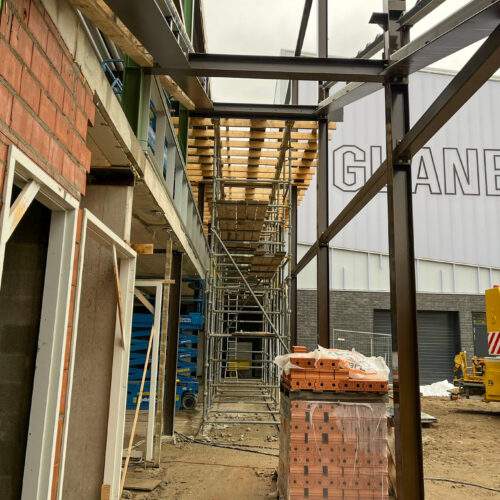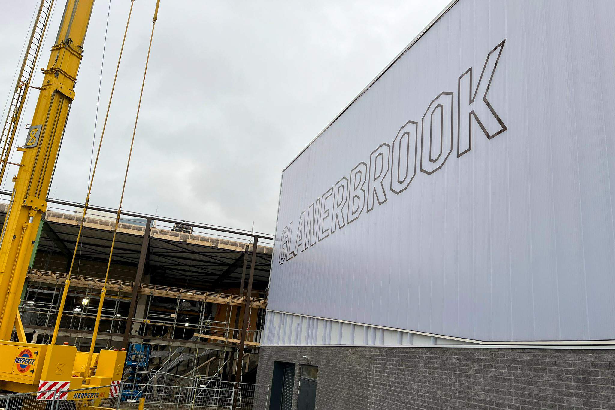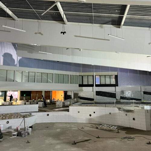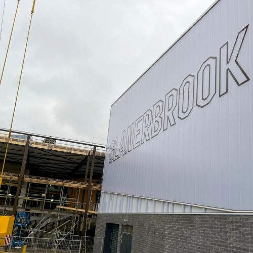 Op het dak is fase 1 afgerond en de materialen voor fase 2 zijn geleverd. Ook zijn voorbereidingen getroffen voor de zonnepanelen bij Sporthal 1 en het 50-meterbad. Binnen vordert de afbouw: de cementvloeren liggen erin, metal stud-wanden worden geplaatst en kozijnen en lichtstraat zijn gemonteerd. Bij de hoofdentree is begonnen met het houten regelwerk. En als mooi herkenningspunt is de naam ‘Glanerbrook’ weer volledig zichtbaar op de gevel.