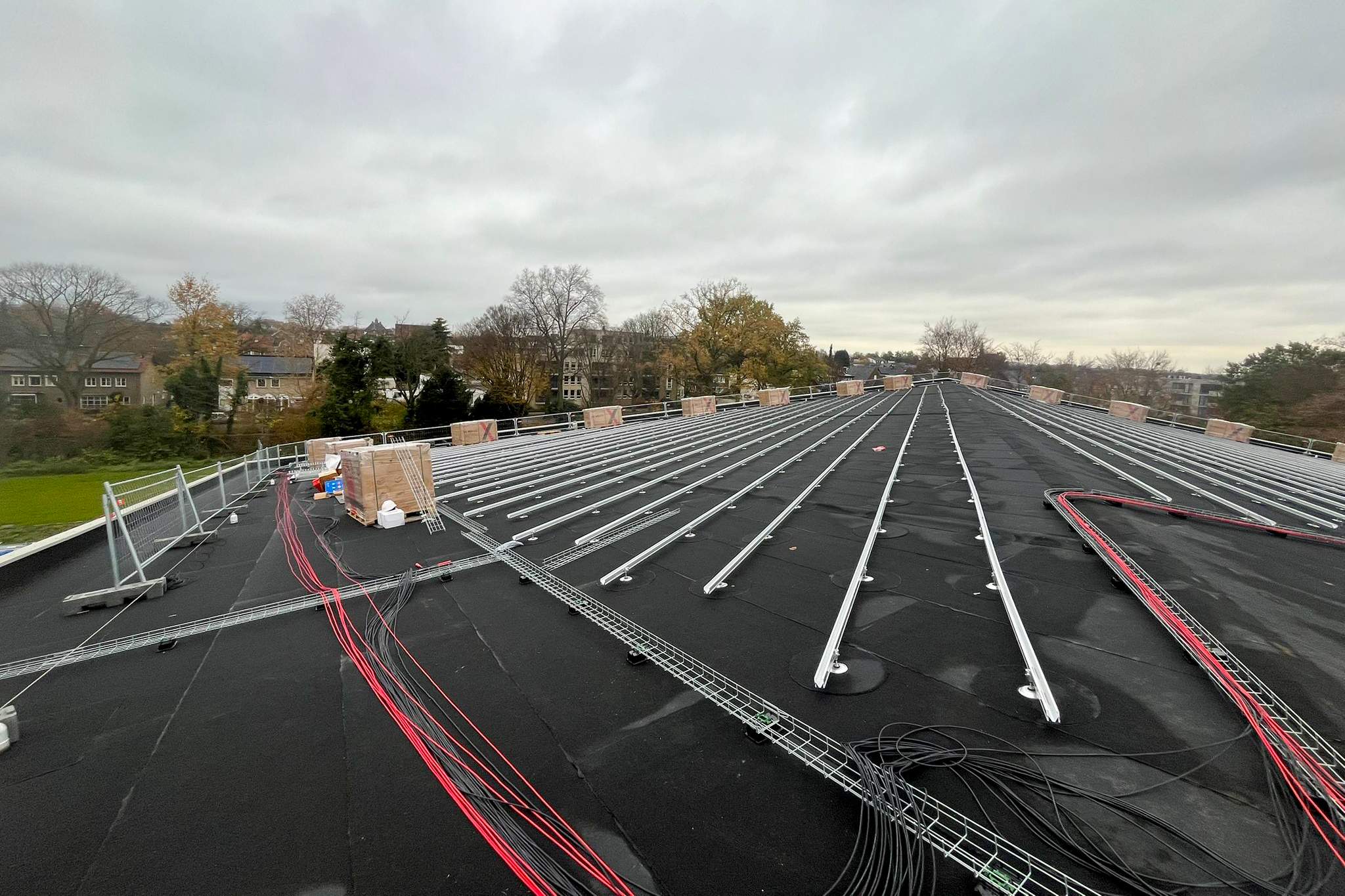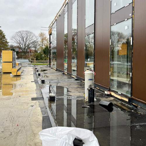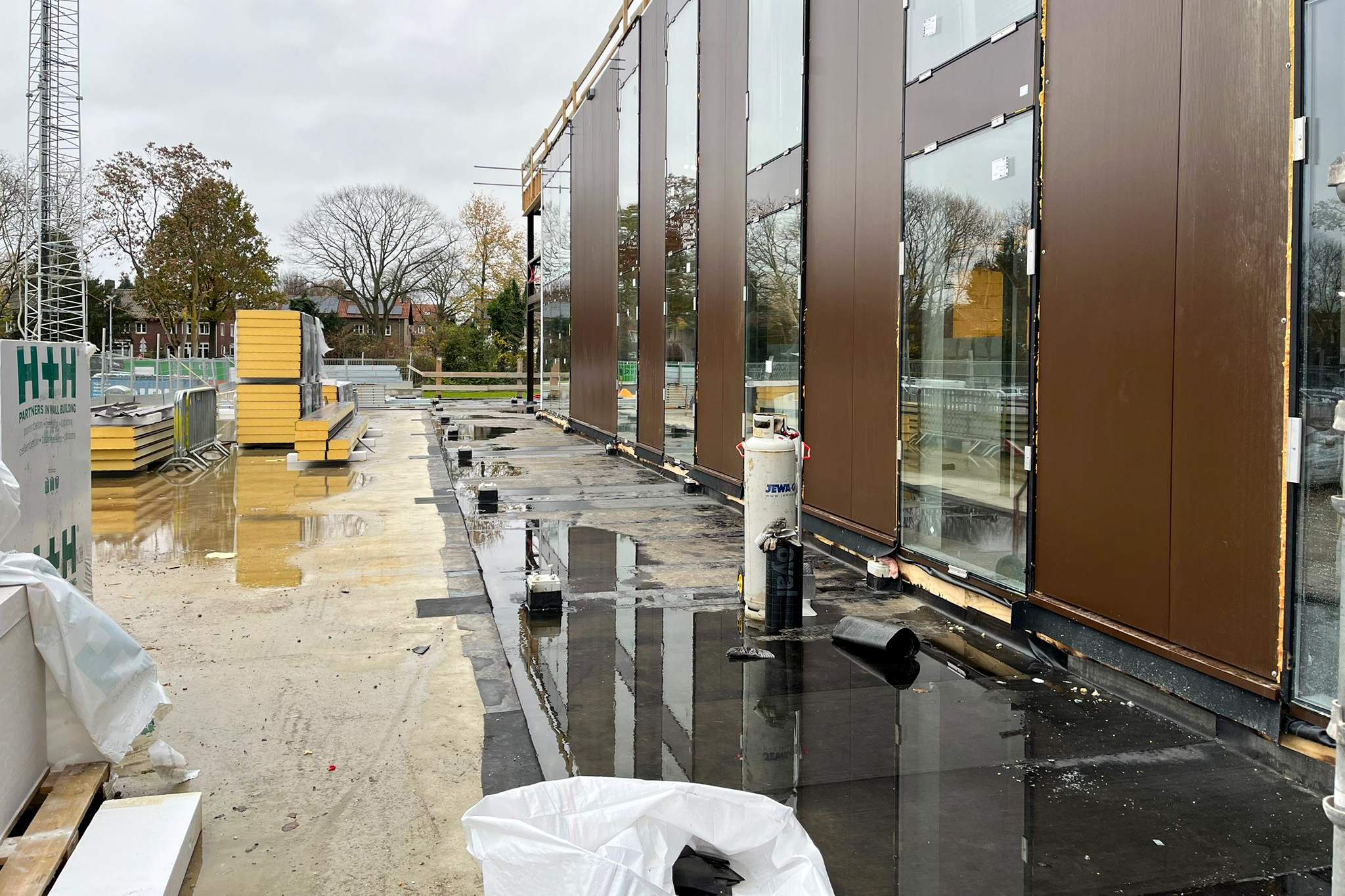 De werkzaamheden aan het entreegebouw lopen volgens planning. De tweede daklaag op de passerelle is aangebracht, de staalconstructie wordt afgedicht en de dakplaten worden binnenkort geplaatst. De betontrap staat en de fietsenstalling krijgt steeds meer vorm. Ook de buitenbeplating met belettering nadert afronding.