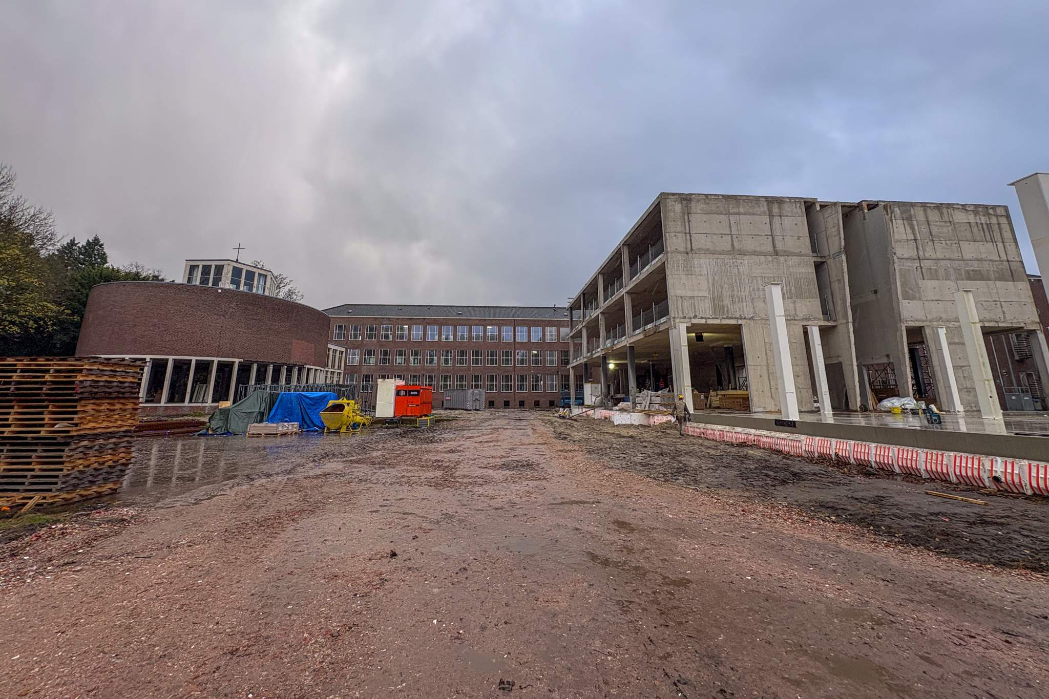 De eerste stalen kolommen van de nieuwbouw staan al overeind. De komende weken gaat de afbouw verder in het bestaande gebouw. Voor het einde van dit jaar storten we de betonvloer van het atrium en plaatsen we aansluitend de gelamineerde houtconstructie.