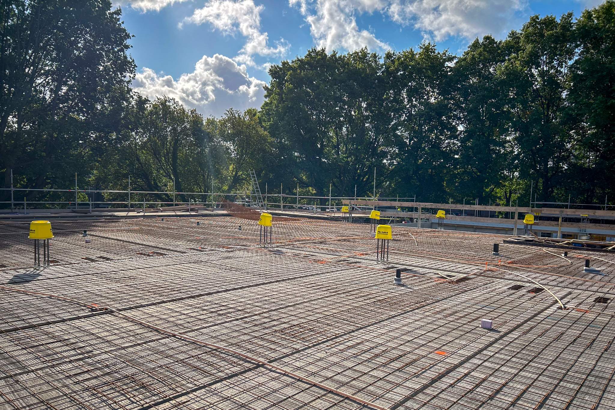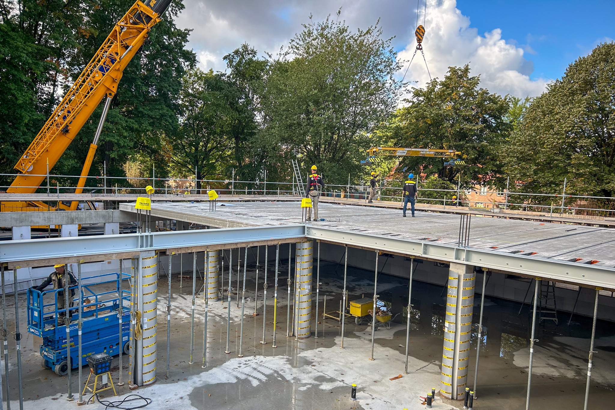 Tegelijkertijd werken we aan de staalconstructie op de tweede verdieping. De bouw verloopt volgens planning en vordert gestaag in de hoogte. Bekijk de video!