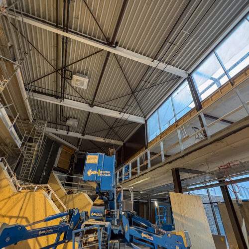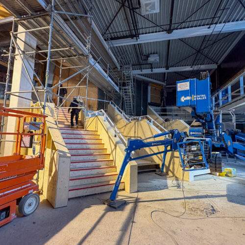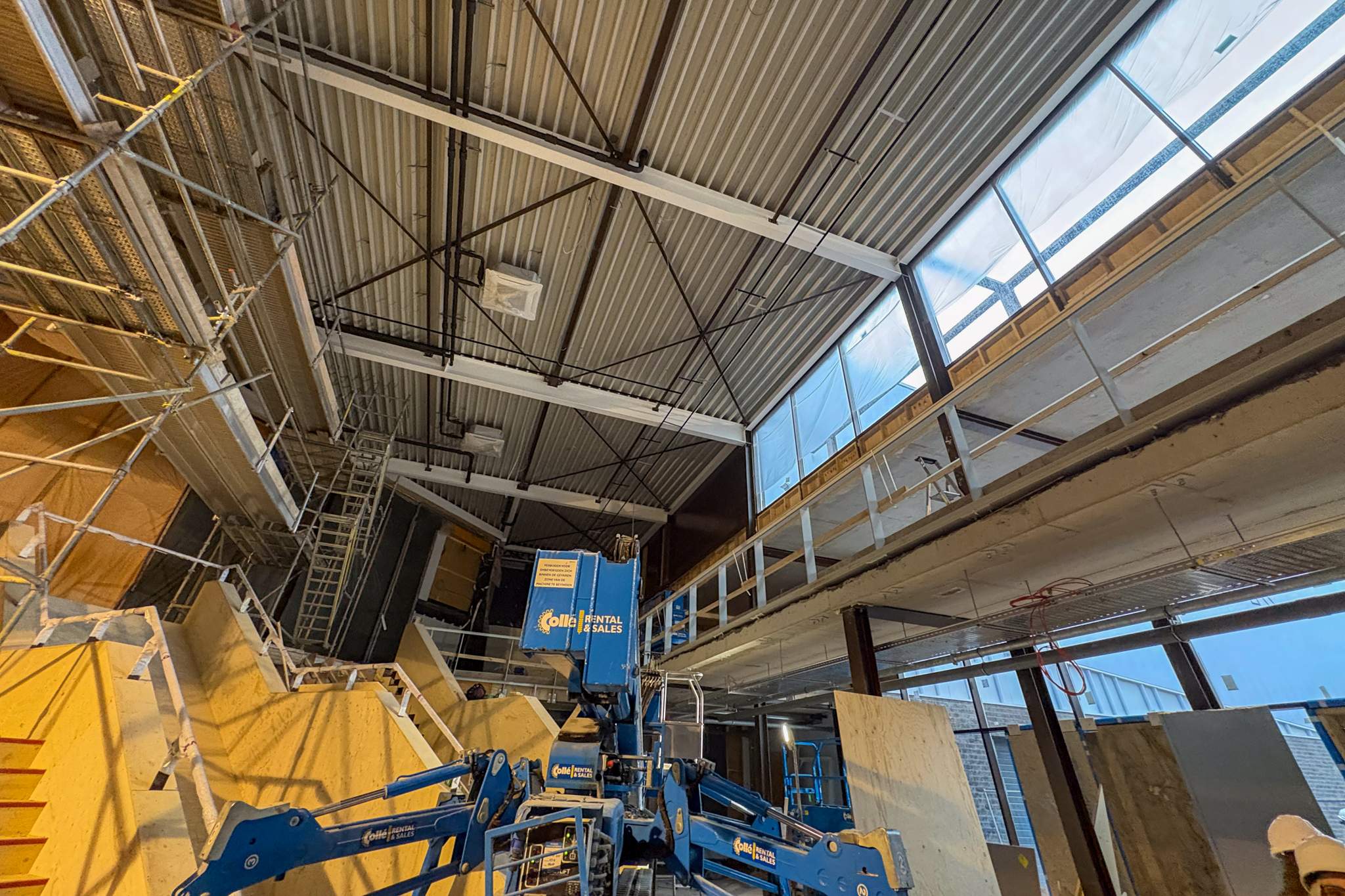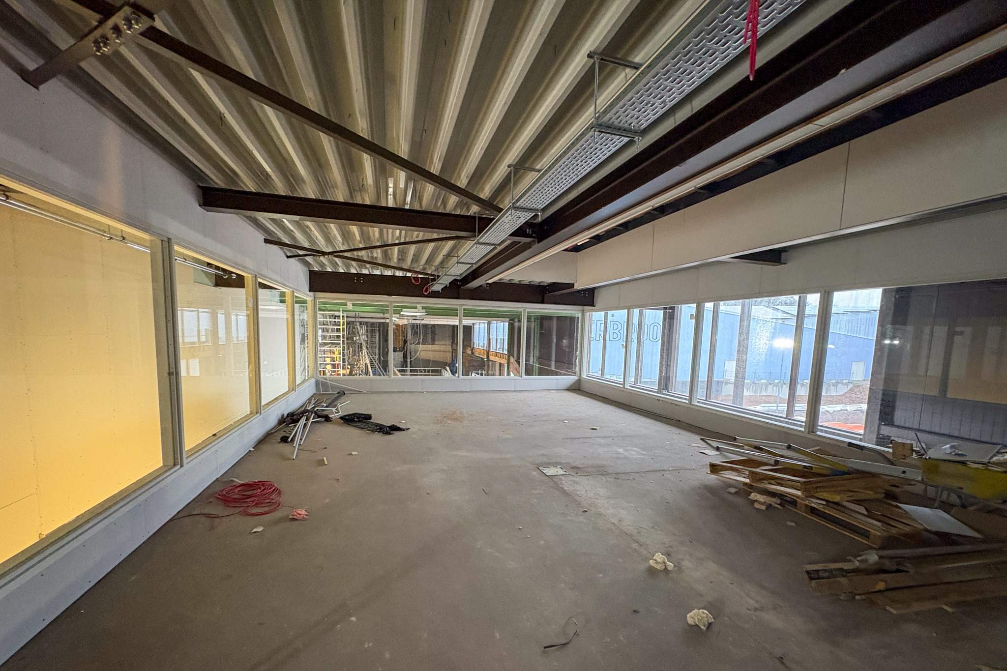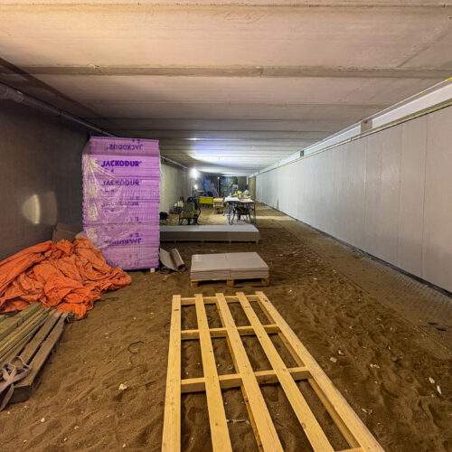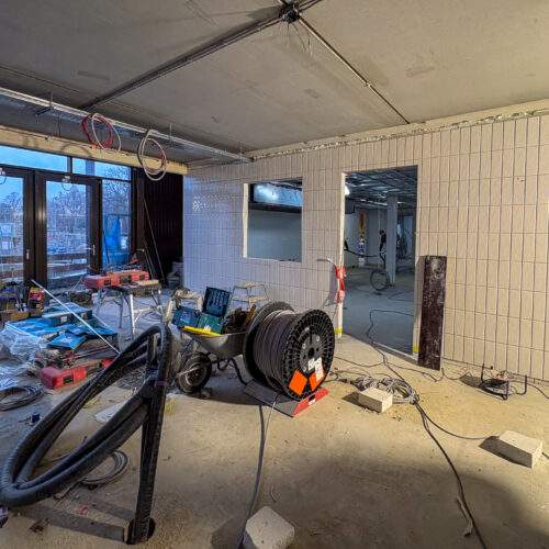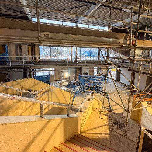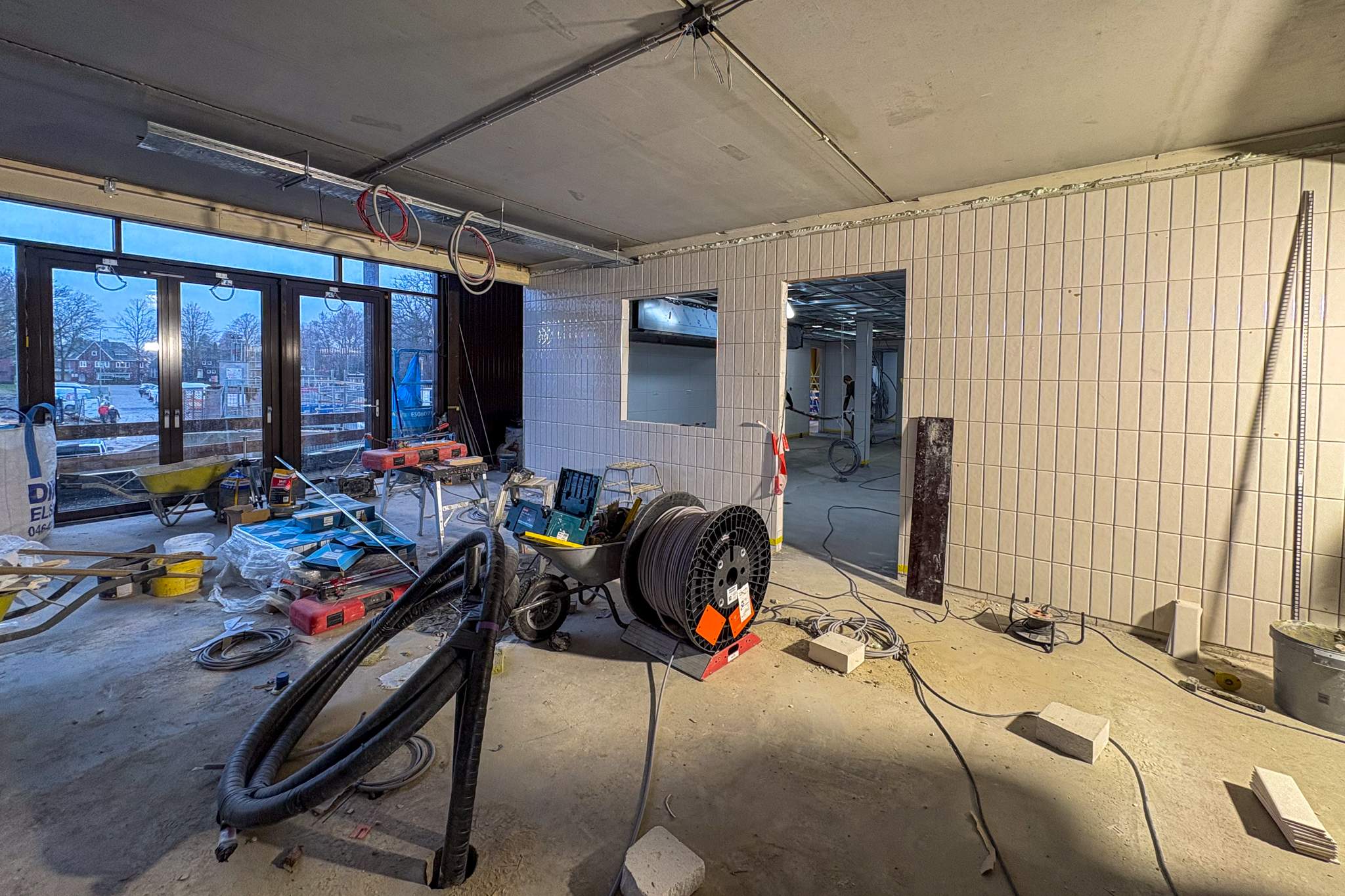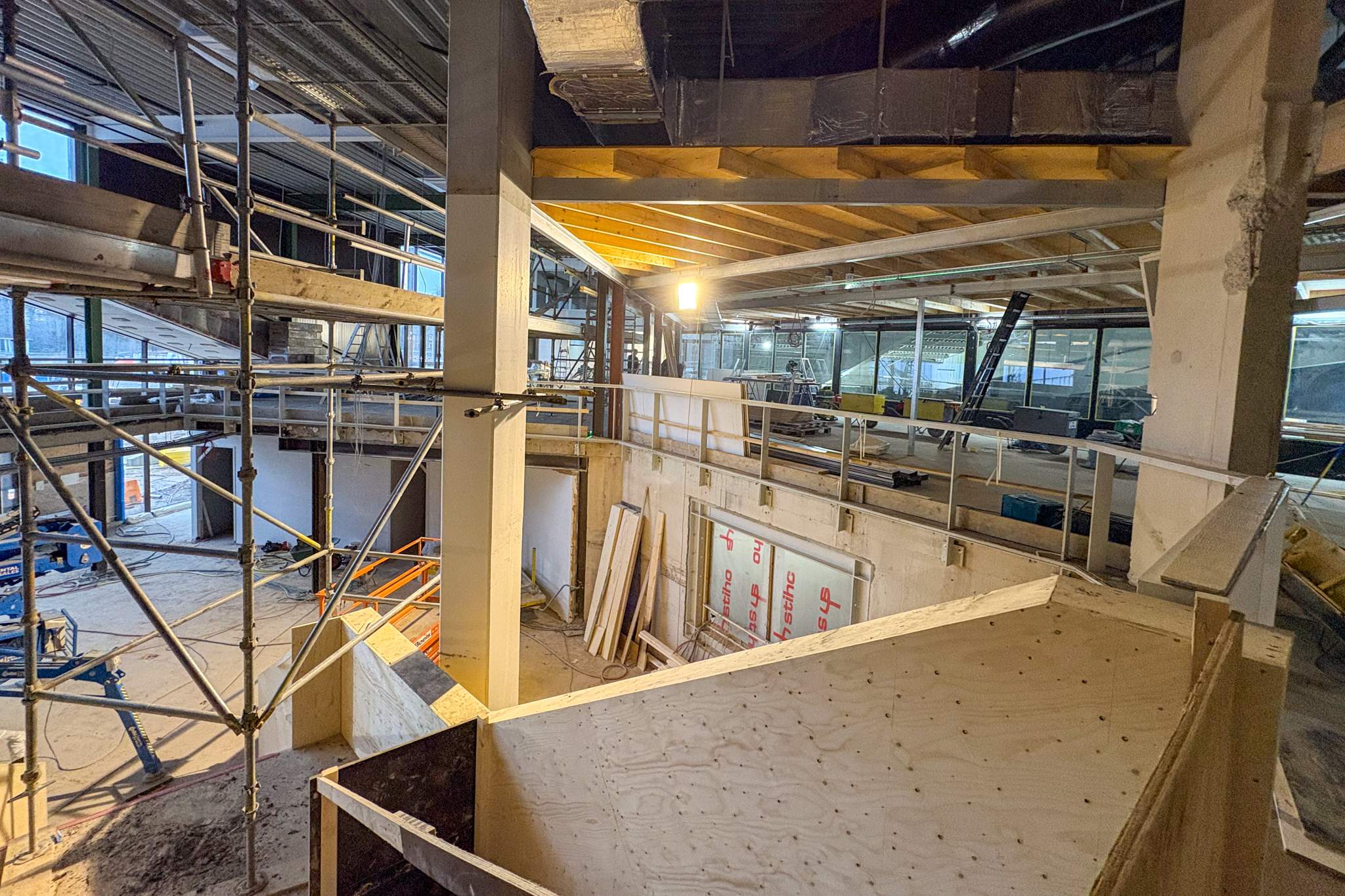 De afbouwwerkzaamheden in het entreegebied en recreatiebad zijn in volle gang. Er is gestart met het aanbrengen van de cementdekvloer in het entreegebied. Ook de schilder is deze week begonnen met de spuitwerkzaamheden van de dakconstructie. Bij de fietsenstalling start de stratenmaker met het maken van de bestrating. In het horecagedeelte is het regelwerk van de systeemplafonds aangebracht, evenals de troffelvloer bij de keuken. Deze week wordt ook het glas van de lichtstraat geplaatst. Ook de betonnen traptredes die straks de loopbrug bedekken worden in de komende week gemonteerd.