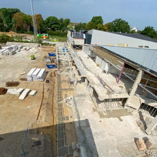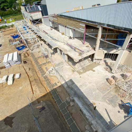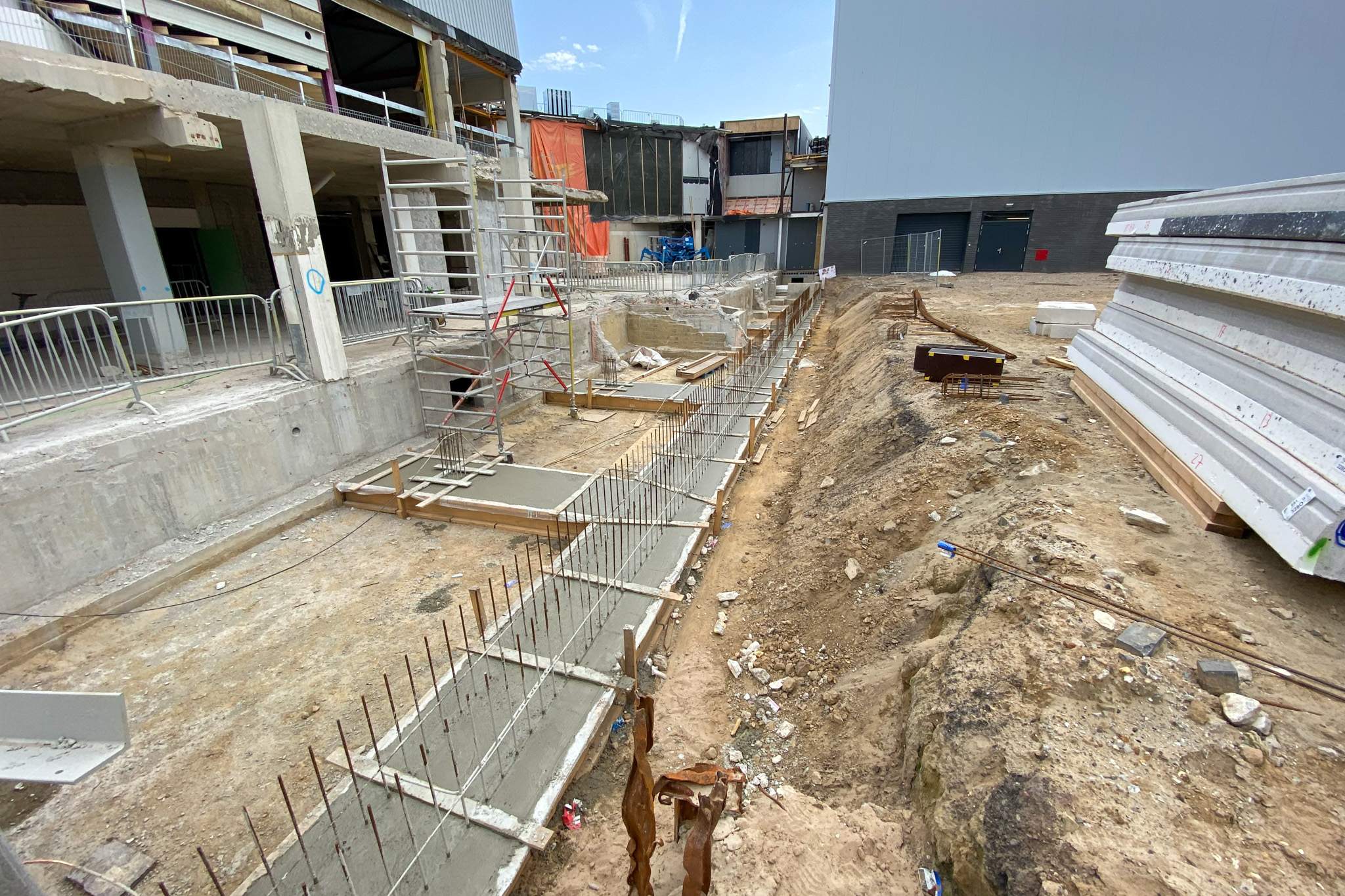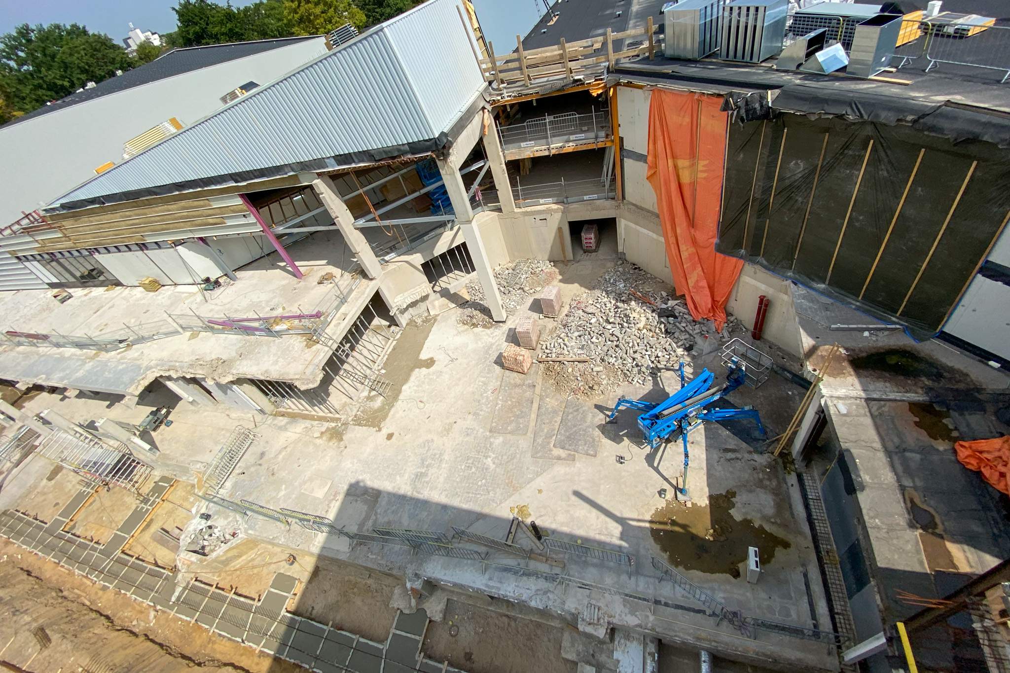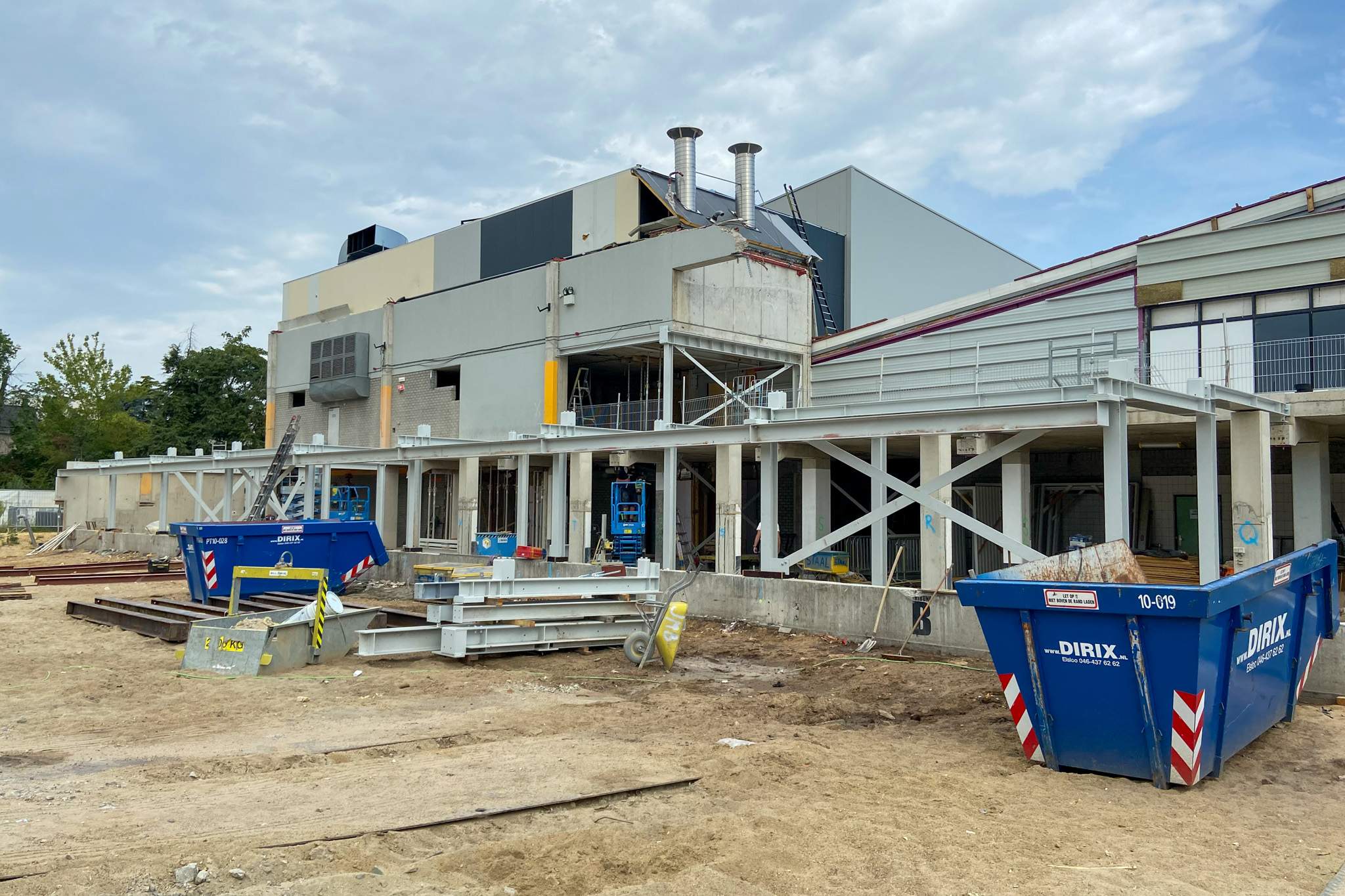 Aan de nieuwbouw wordt volop gewerkt. Buiten worden nieuwe funderingen gestort en staalconstructies opgebouwd, terwijl rondom het gebouw nog oude delen zijn verwijderd en voorbereid worden voor vervanging.