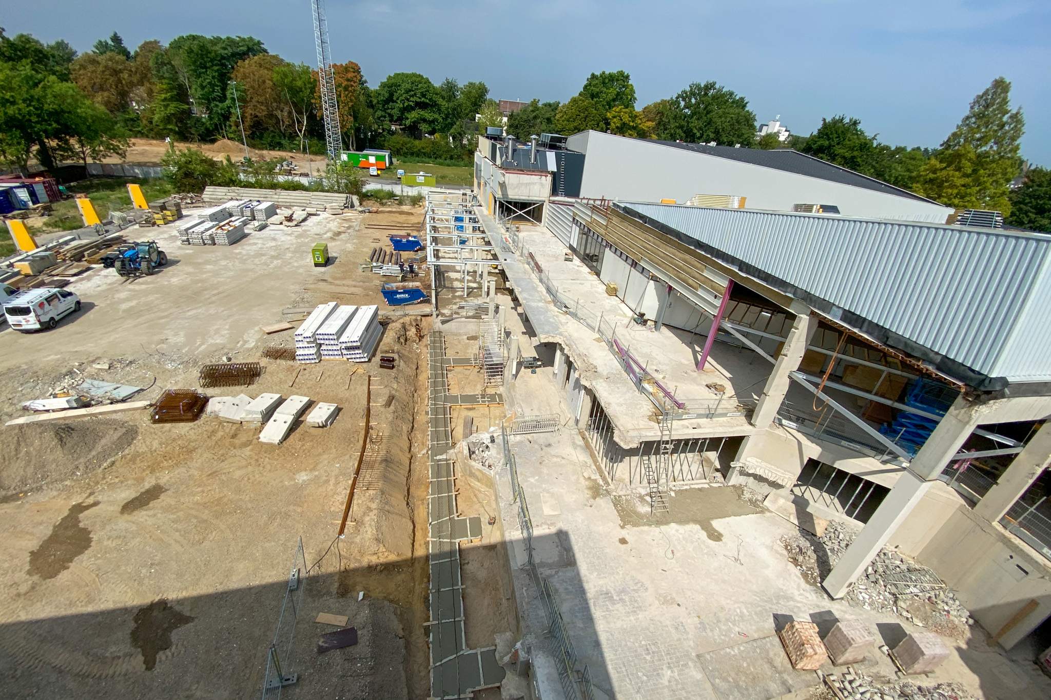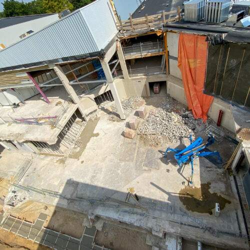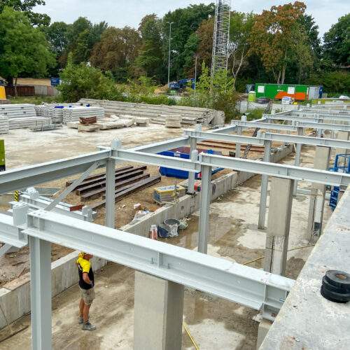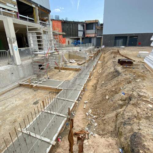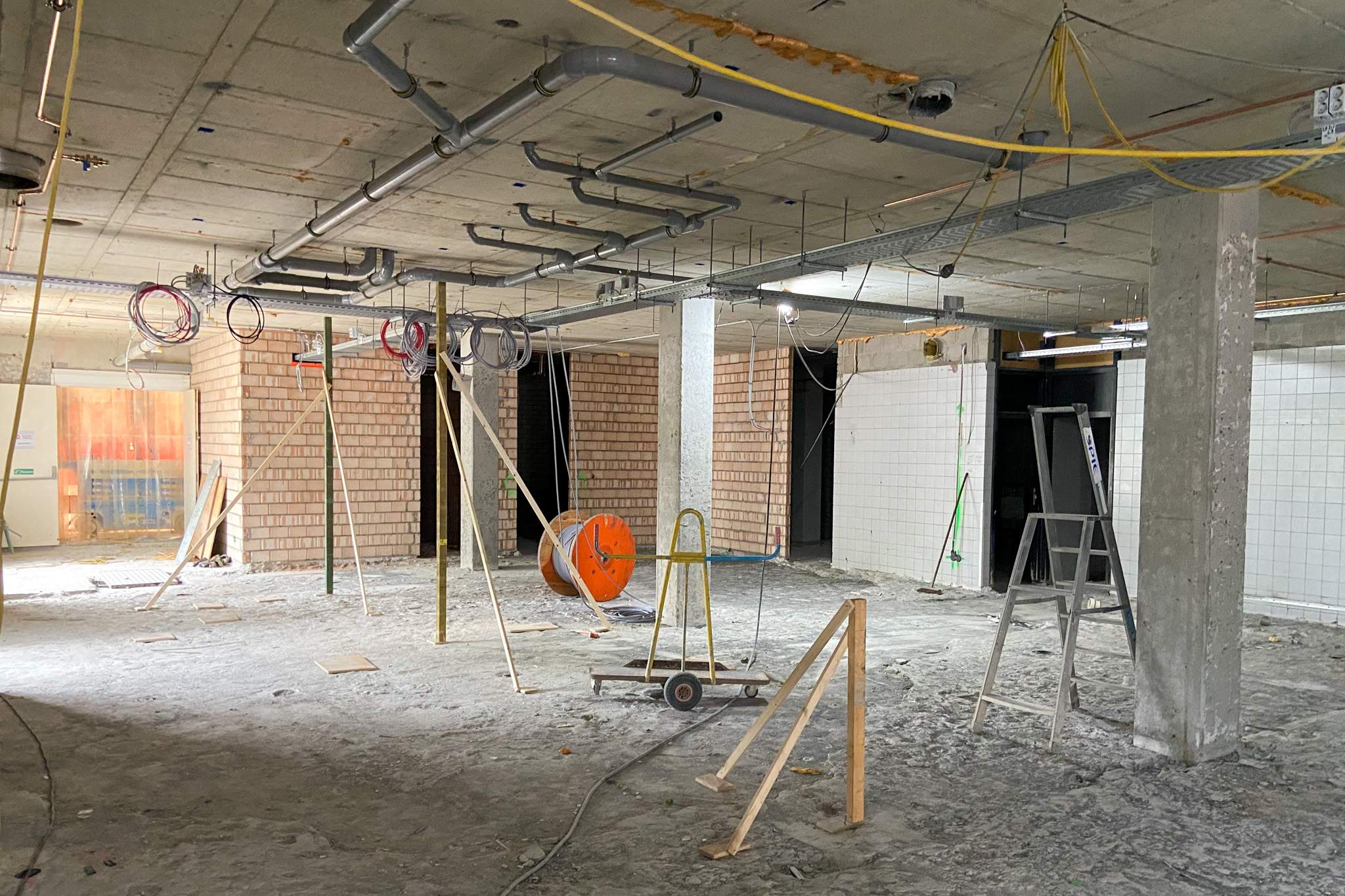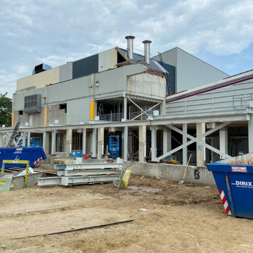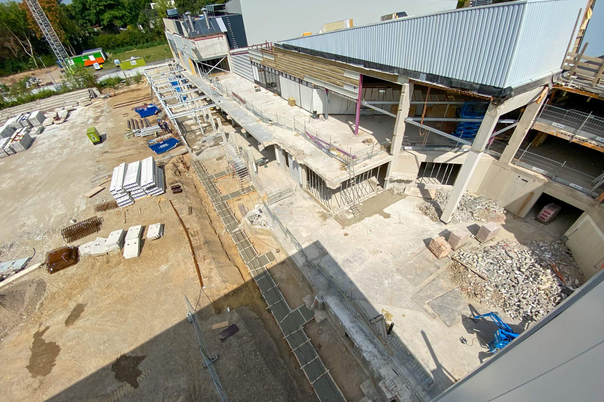 Aan de nieuwbouw wordt volop gewerkt. Buiten worden nieuwe funderingen gestort en staalconstructies opgebouwd, terwijl rondom het gebouw nog oude delen zijn verwijderd en voorbereid worden voor vervanging.