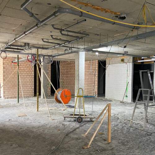 Binnen zijn installaties en leidingen zichtbaar en wordt de ruimte verder gestript en opgebouwd. Ook worden plafonds en wanden vernieuwd, met houten en metalen draagconstructies die al grotendeels zijn geplaatst. Het terrein staat vol materialen, containers en machines, wat laat zien dat de overgang tussen sloop en opbouw in volle gang is.